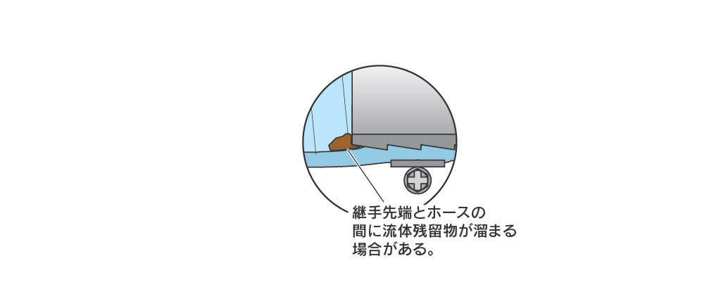 - 液だまりの原因: ホースとホースニップル(タケノコ継手)の接続部分に段差や隙間ができることで、液だまりが発生しやすくなる。
